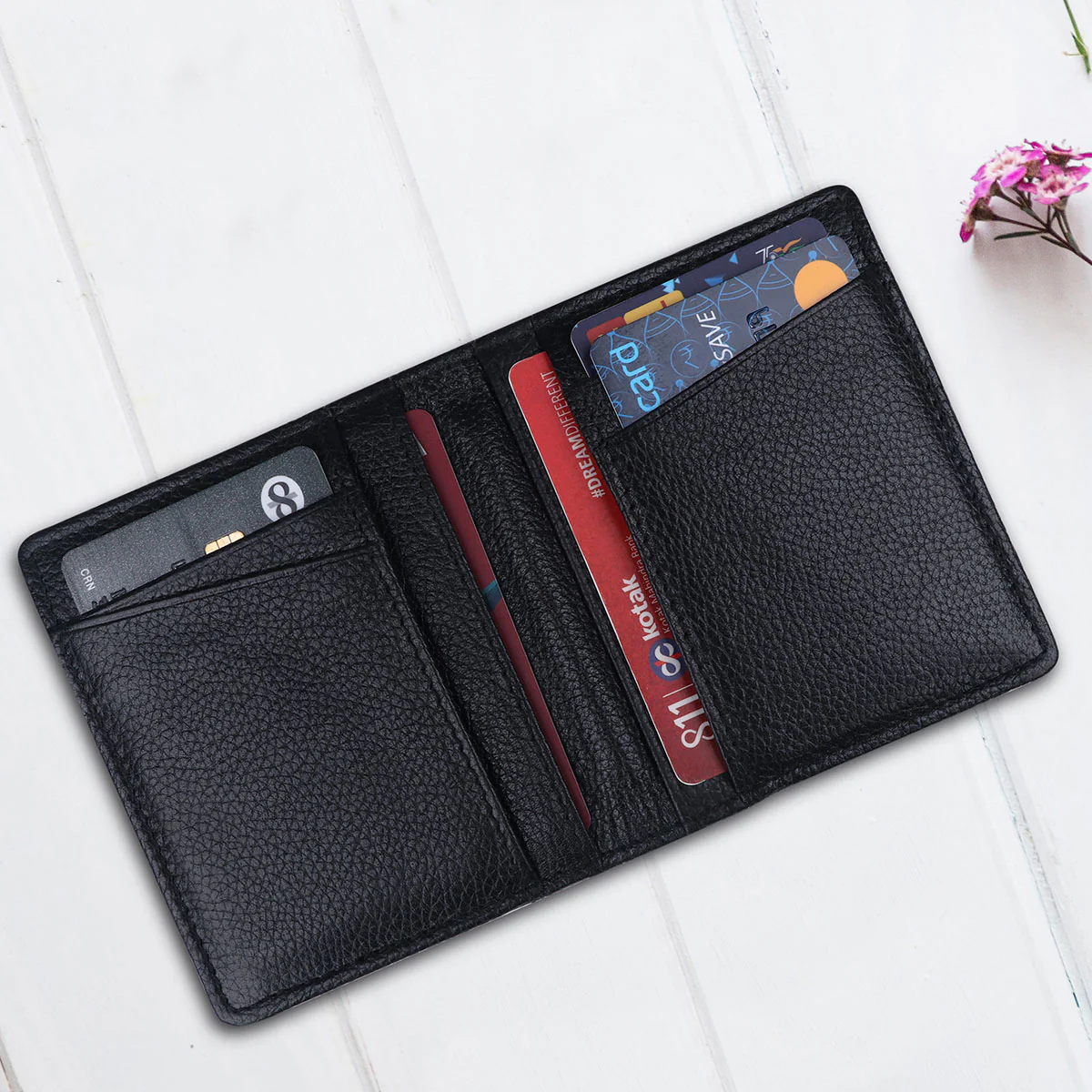 Handcrafted genuine leather wallet and multiple card slots.