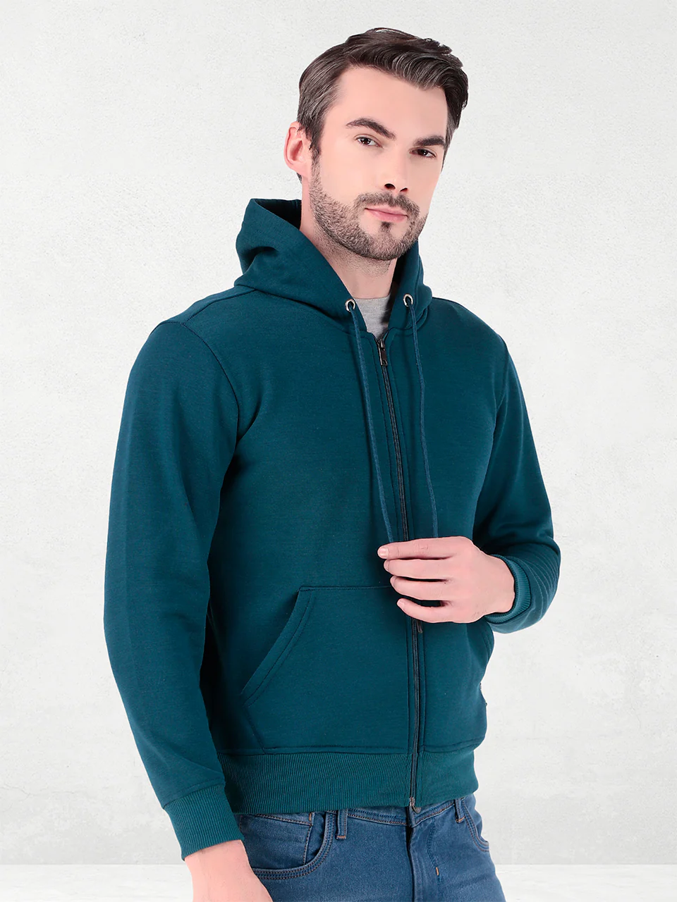 Warm fleece-lined zipper hoodie with ribbed cuffs and pockets.