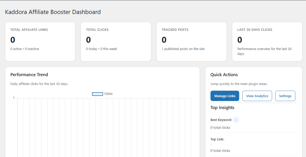 The Dashboard (Admin Panel) of Kaddora Affiliate Booster AI Link Automation for WordPress provides a centralized control system where users can manage, monitor, and optimize their affiliate marketing activities efficiently.