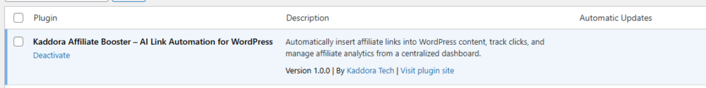 - After successfully Installation & Activation of plugin, you will see Kaddora Affiliate Booster AI Link Automation for WordPress in your installed plugin section, here you can check version and description about the plugin.
