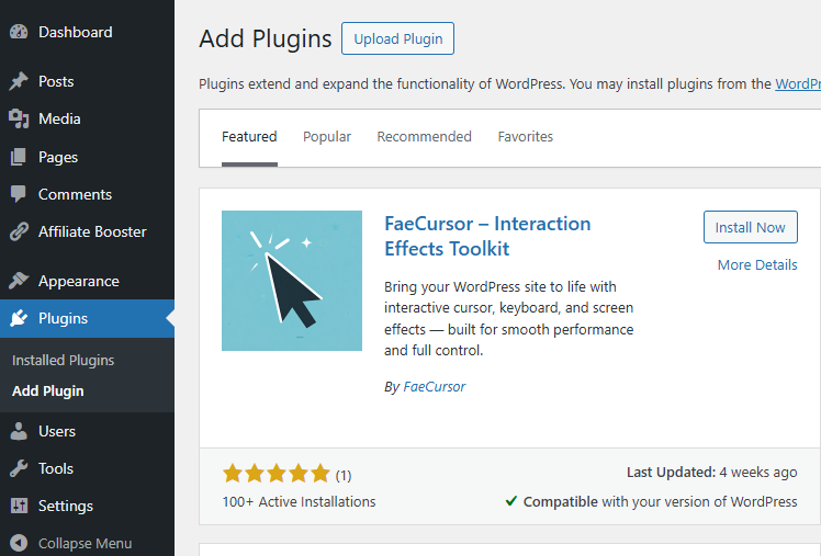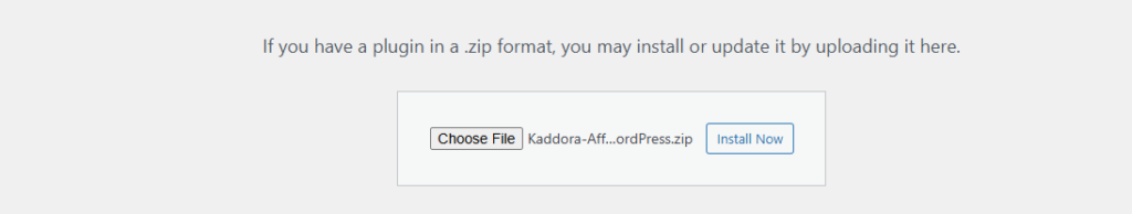 - Upload Plugin > Choose the Kaddora Affiliate Booster AI Link Automation for WordPress.zip plugin file and click Install Now.