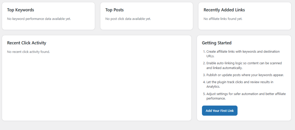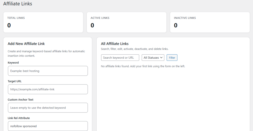 Affiliate marketing often requires manual effort to place links, track performance, and optimize content. This plugin eliminates that complexity by providing a centralized system that handles everything from keyword-based linking to real-time click tracking.