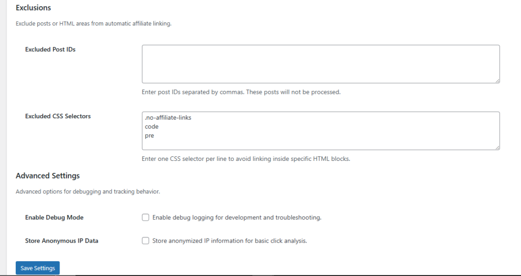 - Exclusions: Prevent linking in specific posts, categories, or tags
